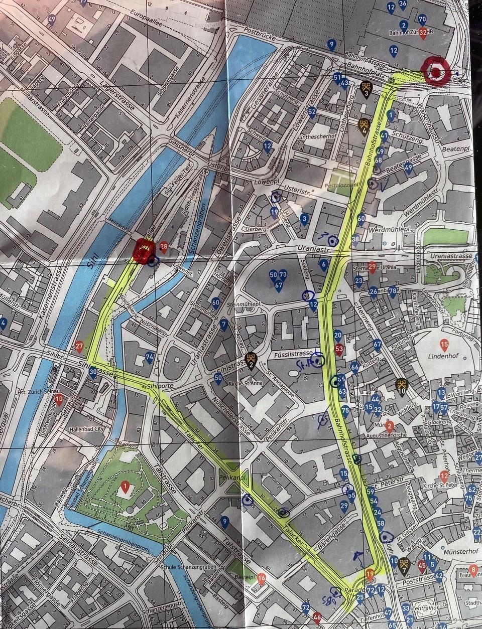 A séta útvonala Bahnhofstrasse - Paradeplatz - Talacker - Gessnerallee (lásd a mellékelt képet a fő képre való kattintás után). A körülbelül egy-másfél órás séta fáradalmát egy közös uzsonnával pihennénk ki a Zeughauskeller étteremben.