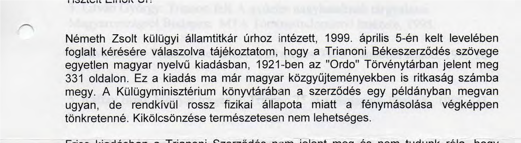 Nemcsak a trianoni, de a második Nagy Háború utáni, Párizsi Békeszerződés, fent említett kiadása egyesületem honlapján megtalálható – a nevezetes levéllel együtt. Ugyanis Balogh Jóskának mindkettő meg volt, ami azután – a Malmöben élő, v. Kovárczy István jóvoltából – aki több mint 30 éven át, havonta egymaga kiadta az „Északi Vártán” folyóiratot – mindkettő nálam is a könyves polcon van - két-két példányban.